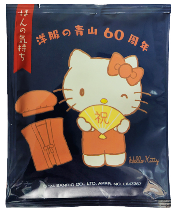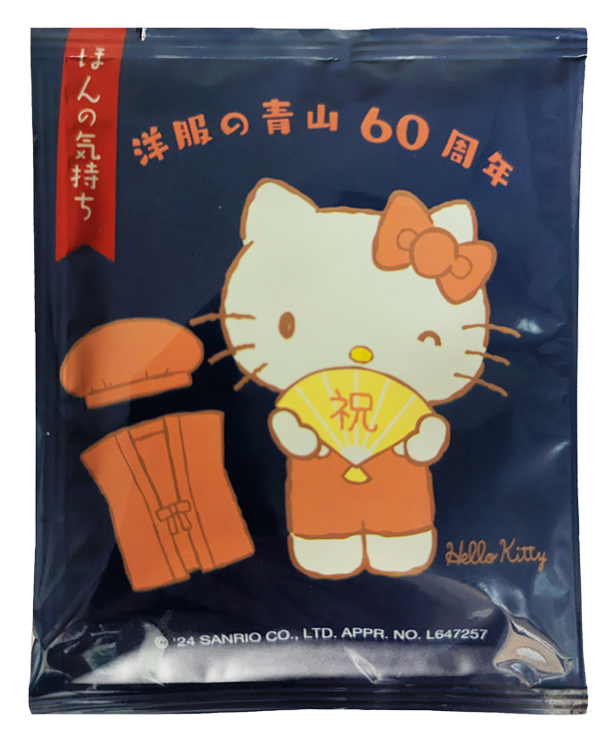 洋服の青山 様から60周年記念のノベルティグッズとしてハローキティデザインのドリップバッグコーヒーが来店者に配布されました。