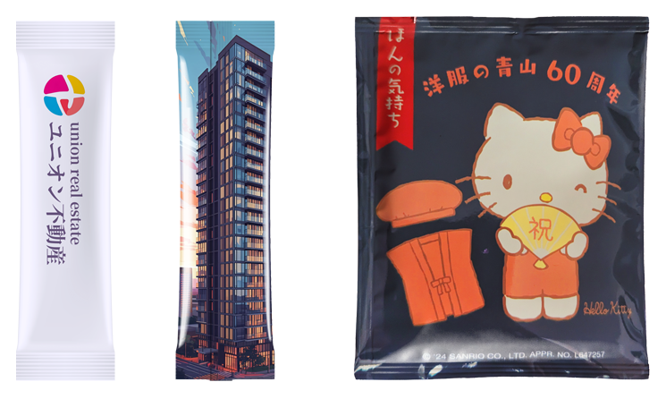 洋服の青山 様から60周年記念の ノベルティグッズとしてハローキティデザインの ドリップバッグコーヒーが来店者に配布されました。 弊社では、依頼されたデザインで 計20万個のドリップバッグを作成しました。